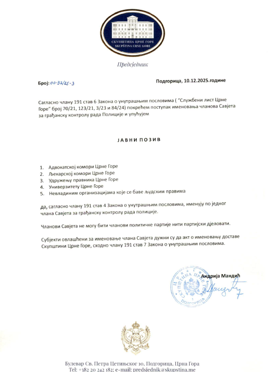 Podgorica, 10. december 2025. godine - Predsjednik Skupštine Crne Gore, Andrija Mandić, uputio je Javni poziv za imenovanje članova_ica Savjeta za građansku kontrolu rada policije.